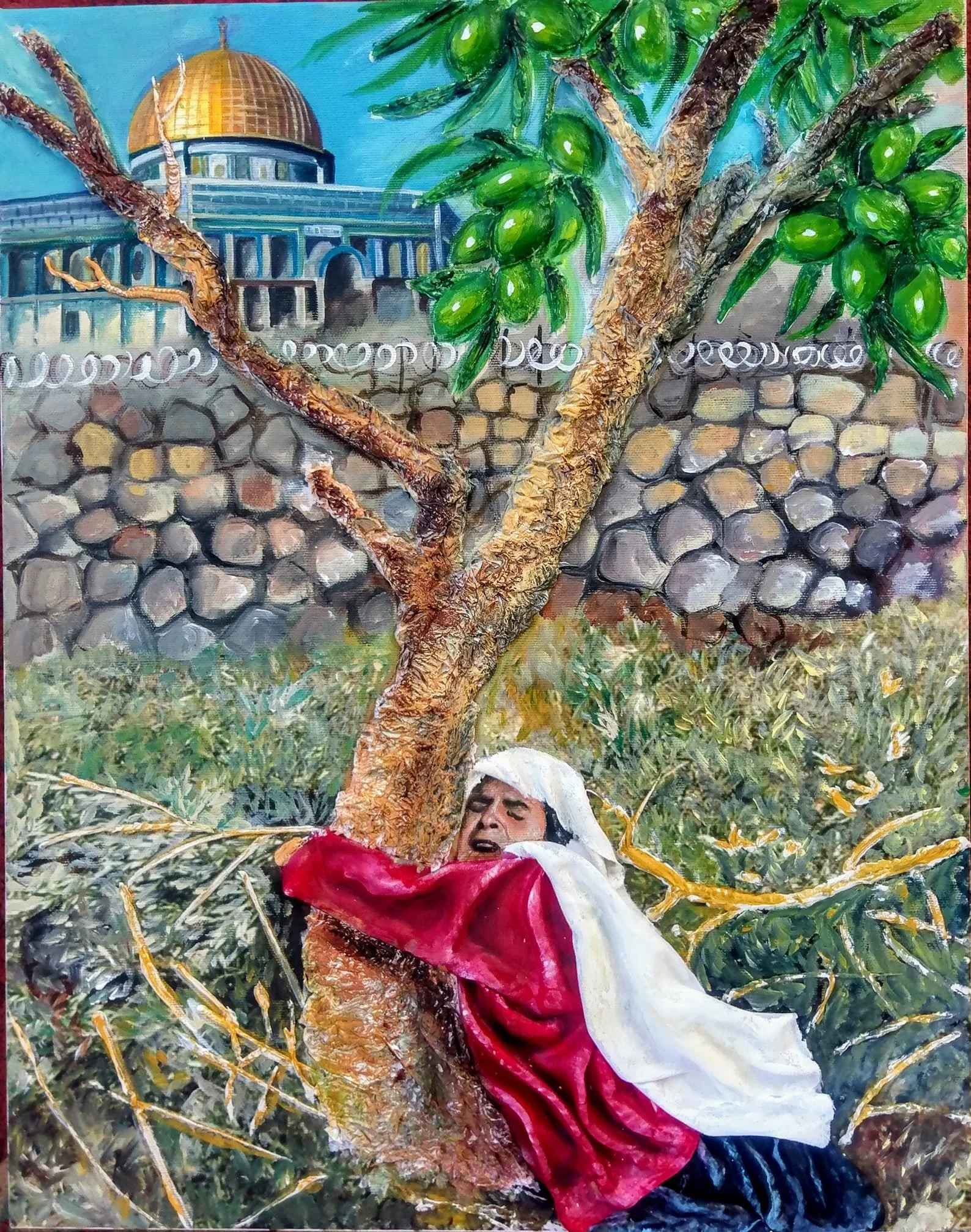 Artist statment: Palestinian do value their olive trees since they symbolize strength, perseverance and most importantly resistance. The painting shows the unflinching love of a Palestinian woman holding firmly an olive tree to prevent others fron cutting it down. The dome of the rock stands with pride as the third most important place in Islam. But the wall is preventing Palestinian people from getting access to the mosque despite living so close to it